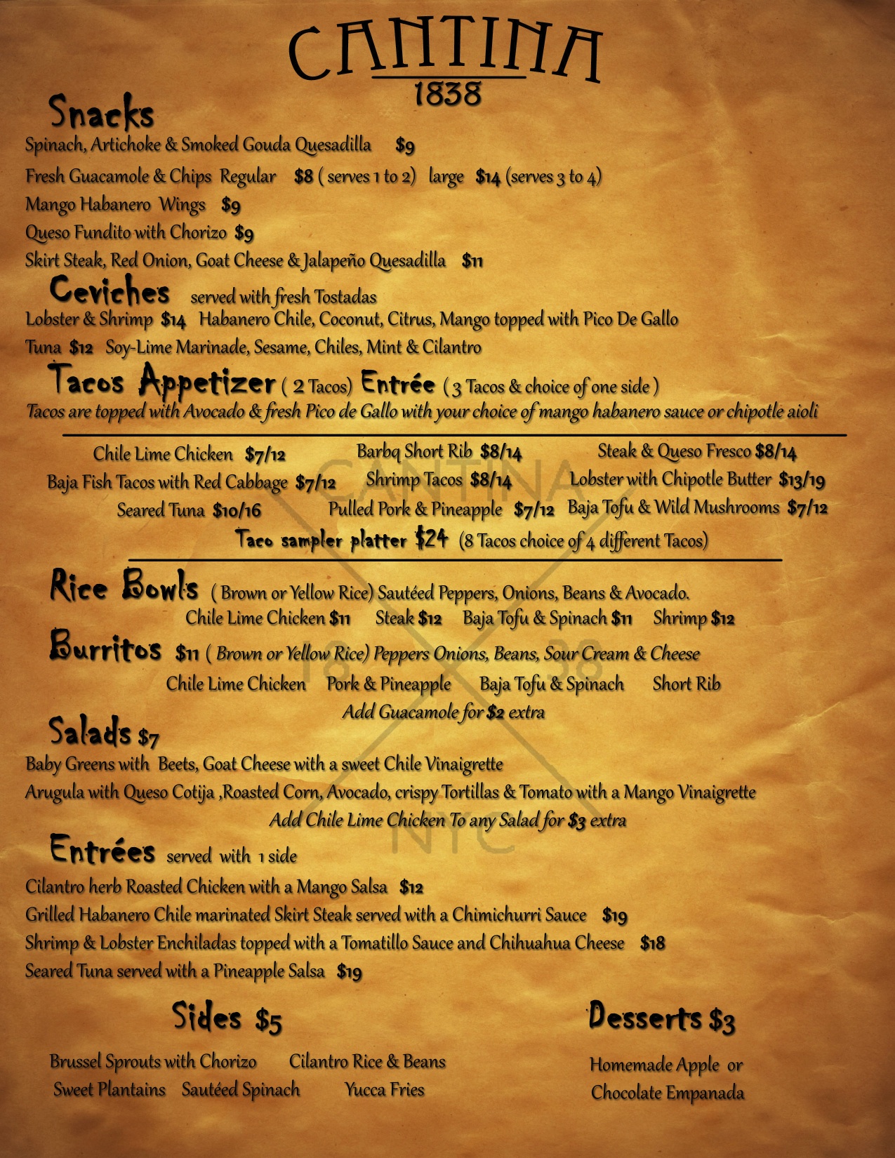 The price point of the Cantina menu will be below $19. One of the owners of Cantina said, “everything on the menu will be reasonable and affordable, yet everything offered will be of a high-end product.” The chef at Cantina will be coming from Dos Toros in Union Square.