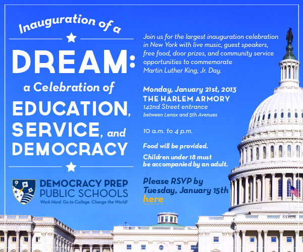 This January 21st, Democracy Prep Public Schools, which operates six charter schools in the Harlem area, will be hosting “Inauguration of a DREAM: a Celebration of Education, Service, and Democracy” from 10 am to 4 pm at the Harlem Armory. This event is free and open to the public. It will feature live music, guest speakers, food, door prizes, and community service opportunities to commemorate Martin Luther King Jr. Day. This event will coincide with the second Presidential Inauguration of President Barack Obama.