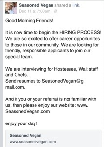 Seasoned Vegan is not open yet, but they’re taking another step in that direction. According to their Facebook page, they are now hiring for several positions, such as Hostesses, Wait staff and Chefs. Interested folks should send resumes to SeasonedVegan@gmail.com. Good luck to those applying! And thanks to the reader who alerted us of this!