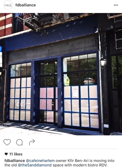 Wondering whose taking over the commercial space in Harlem that was formally owned by 5 and Diamond? We are learning today through Instagram via the FDB Alliance that the owner of Cafeine Urban Espresso at 2124 Frederick Douglass Blvd is taking over the place. Mr. Ben-Ari is planning to open a modern bistro called RDV at 2072 FDB.