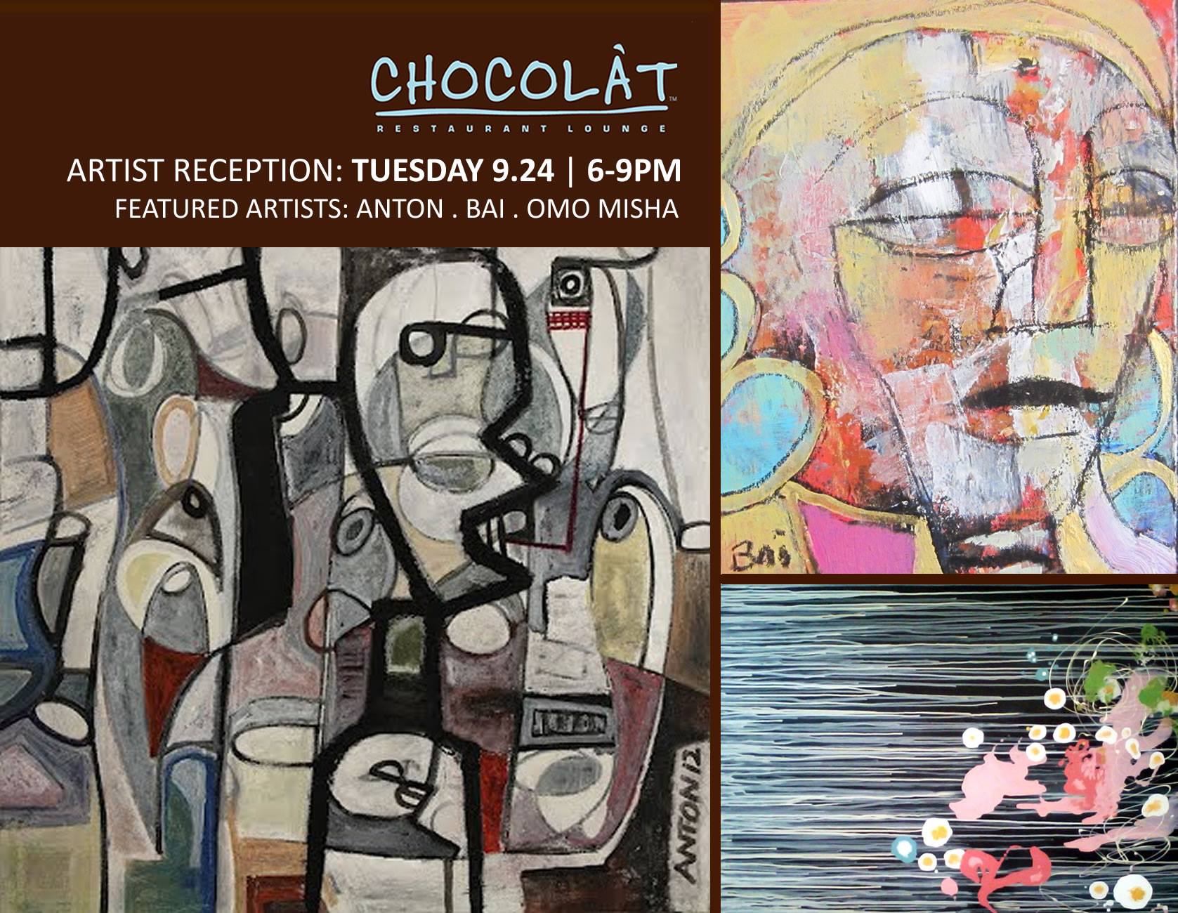 Next Tuesday, September 24th from 6-9 pm, Chocolat Restaurant in Harlem will be hosting an intimate reception for two exhibiting artists, Anton and Bai. Some of Anton and Bai’s paintings and mixed-media work has already been on view at Chocolat this past summer. At the Sept. 24th artist reception, guests can meet and socialize with the artists and see more of their creative works.