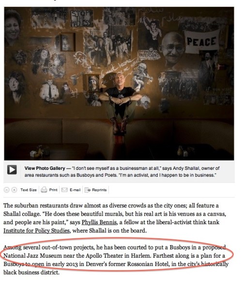 While apartment hunting throughout Harlem with a good friend this past weekend, I stumbled across some interesting information. A sales representative at 2280 Frederick Douglass Blvd., one of the new condo buildings built from the ground up in West Harlem, made a point to say to the potential buyer that their retail space was in contract with Busboys and Poets from Washington, D.C., a restaurant, bookstore, fair trade market and gathering place where people can discuss issues of importance.