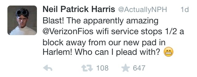 The last time Harlem resident Neil Patrick Harris tweeted out something, he eventually got it, which was a Harlem brownstone. Now he can’t get the wifi service he wants so who does he turn to? Twitter. About a day ago NPH tweets out, Verizon Fios service does not reach his new Harlem brownstone. Apparently the service stops about a block away. That’s weird. Why would Verizon Fios stop close to 125th Street in Central Harlem?