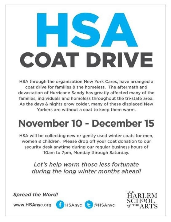 The Harlem School of the Arts (HSA) is hosting a coat drive this month and part of next month through the organization New York Cares. HSA will be collecting new or gently used coats for men, women and children during its regular business hours of 10 am to 7 pm Monday through Saturday. HSA is located at 645 St. Nicholas Avenue between West 141st and 142nd Street or call 212-926-4100.