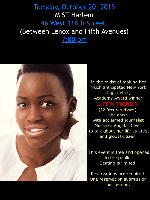 If you were looking to attend the free event at MIST Harlem featuring fashion darling and Oscar winner Lupita Nyong’o, forget about it. Drats! It’s sold out. Nyong’o plans to visit Harlem October 20th to plug her new play downtown at The Public Theater called Eclipsed!