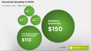 The shopping category came in third in terms of the top three spending areas. Harlemites from 10030 spend a total of $332. That figure is divided among general shopping at $150, clothing, shoes and outer wear at $113 and $69 goes towards electronics, office supplies and hobbies.