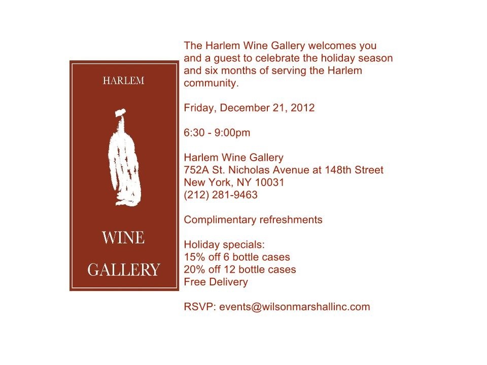 Need plans Friday night that will take care of your wine shopping needs? Consider the Harlem Wine Gallery in Harlem’s Hamilton Heights. They’re having a party this Friday evening, Dec. 21st that includes discounts on wine. Check out the details below and if you’re planning on attending don’t forget to RSVP.