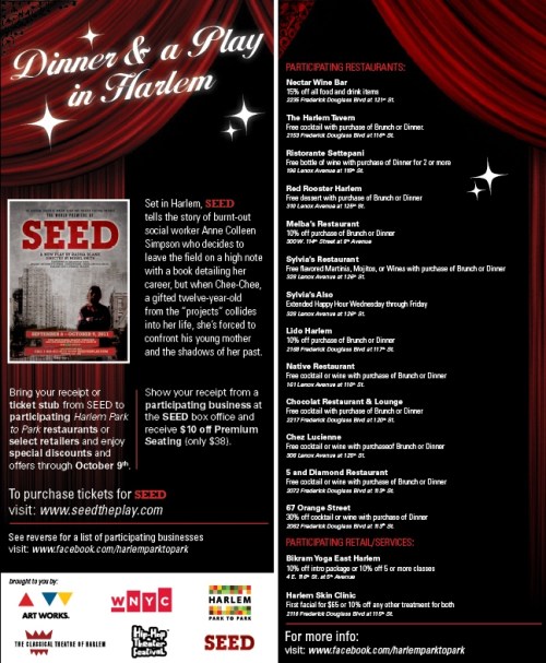 See the play SEED and in turn receive special discounts at select Harlem establishments