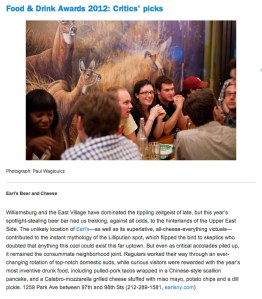 their published online article (See photo left). Red Rooster, located on Lenox Avenue between 125th and 126th Street was named Best New Neighborhood Joint. And Earl’s Beer and Cheese, located in SPANISH HARLEM since the restaurant is above 96th Street on the East Side, was named Best Pint-Size Powerhouse. TONY said Earl’s was located on the Upper East Side. Wrong! I am hoping it was a typo given this magazine reports on NYC every week.