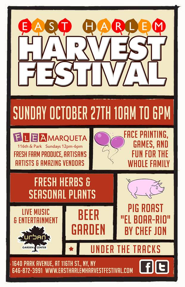 The second annual East Harlem Harvest Festival is happening this weekend, October 27, at 116th Street and Park Avenue. The event starts and 10 am and will last until about 6 pm. See full list below of what to expect at this years East Harlem Harvest Festival.